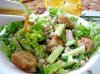 Огурец режем соломкой, мелко режем зеленый лук, листья салата рвем руками. Смешиваем перловку с мясом и овощами, перед подачей поливаем соусом.