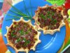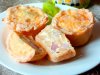 Раскатать тесто в пласт толщиной 3 мм, вырезать кружочки диаметром 10 – 12 см, смазать яйцом, положить в углубления в форме для маффинов. Положить по одной- две ложки начинки, сверху смазать майонезом, посыпать тертым сыром.