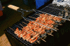 Делаем соус: пассеруем на сковороде лук (репчатую луковку режем кубиками), добавляем яблочный сок, посыпаем арахисом и карри, перчим, солим и тушим пять минут.