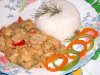 Рыбное филе режем кубиками (крупными). Обваливаем в муке, потом макаем в яйца и жарим во фритюре до готовности. Рис отвариваем в соленой водичке до готовности. Сливаем воду и слегка обсушиваем рис. Болгарский перчик и лук режем кубиками. Обжариваем на масле. Смешиваем рыбу, рис и перец с луком.