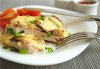 В форму для запекания выкаладываем отбивные, на них слой пассерованного лука и морковки, потом перец, помидоры, делаем сеточку из майонеза. Выкладываем кружочки маслин, посыпаем тертым сыром. В форму наливаем 50 мл. воды, ставим в разогретую до 200 градусов духовку и запекаем 15 минут.