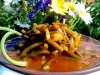 Чесночные стрелки шумовкой вынуть из воды, сразу же переложить к кунжуту, приправить мелко нарезанным чесноком, залить подготовленной смесью. По желанию можно добавить специи, приправы. Когда стрелки немного остынут, смешать их с корейской морковкой и перемешать. Поставить в холодильник на три – четыре часа чтобы салат настоялся.