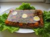 Когда заливное застынет, вынимаем его из формы, кладем на блюдо, украшаем ломтиками лимончика и салатными листьями.