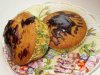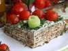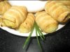 На блюдо нужно выложить листья салата, а на них ломтики рулетов, на каждый из которых положить кусочек поре5занного филе селедки.