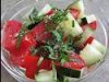Помидоры порезать ломтиками, огурцы - брусочками, болгарский перец- полосками.