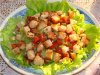 На тарелки разложить овощной салат, сверху положить кусочки куриного филе, посыпать кубиками хлеба с чесноком и полить заправкой. Приятного аппетита!