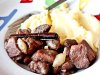 Маринованное мясо выкладываем в разогретое растительное масло, обжариваем до изменения цвета. По времени – минут пять. Добавляем красное вино, тушим мясо три минуты, всыпаем яблоки. Тушим все вместе еще две – три минуты. Начинка для яблок готова.