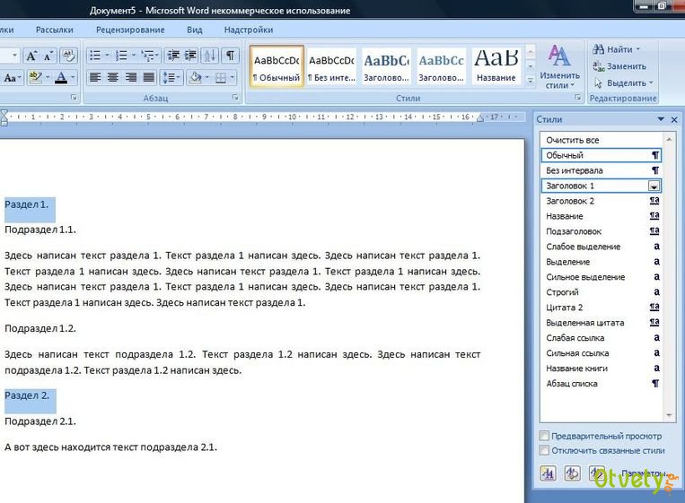 3. После этого выделите такой текст: «Подраздел 1. 1». Аналогичным образом, описанным во втором пункте, задайте данному тексту следующий стиль «Заголовок 2».