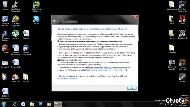 Как убрать подлинность windows 7? Согласитесь, что большое количество пользователей в настоящий момент применяют именно не лицензионную операционную систему, под названием Windows 7. Безусловно, в последнее время в специализированных магазинах можно найти компьютеры, на которых уже установлена лицензионная Windows "Домашняя базовая", но, некоторым, все же, бывает ее не достаточно, поэтому они приходят домой и пытаются установить самостоятельно разнообразные сборки Windows 7 "Ultimate" или же "Prafessional". Отсюда, собственно, и появляется сама проблема, когда после процесса обновления в углу образуется надпись, которая бесит каждого пользователя - "Ваша копия систмы Windows 7 не является подлинной". Дело в том, что фон рабочего стола при наличии такой надписи все время меняется на черный цвет. Поэтому, и возникает вопрос о том, как убрать надпись о подлинности windows 7? Само собой, что хакеры уже создали огромное количество разнообразных активаторов, но, все же на некоторых ресурсах можно найти ответ на вопрос, как убрать надпись в углу, а также черный экран самостоятельно вручную, методом удаления информации из реестра, а также путем удаления скрытых системных файлов. Вы также можете скачать и после запустить совершенно бесплатный активатор Windows 7, который все сделает за Вас самостоятельно, причем в автоматическом режиме. При этом, вы всегда должны помнить о том, что в последнее время корпорация Microsoft применяет разнообразные способы проверки подлинности, что, главным образом, происходит при помощи обновлений. Поэтому, после того, как вы установите на свой компьютер данный активатор, не нужно спешить его удалять, поскольку он может еще вам пригодиться. Представляем ниже вашему вниманию несколько эффективных способов, как устранить подлинность Windows 7. Способ первый. Стоит отметить, что сам процесс первой активации очень прост, а также понятен интуитивно. Вам необходимо скачать программку, а затем установить ее на свой компьютер. Все, теперь ваша копия системы Windows является активированной. Если по определенными причинам активация продукта прервалась или полностью слетела (как правило, она держится не менее одного года), тогда, если вы снова запустите программу, произойдет автоматическое удаление предыдущей установки активатора, а также ваш компьютер пойдет на перезагрузку. Затем, после того, как он снова загрузится, вам необходимо вновь запустить активатор и он активирует вам Windows 7, при этом, также уберет надоедливое сообщение о подлинности системы, расположенное в правом углу экрана монитора, а также разнообразные периодически всплывающие окна в процессе загрузки системы. Стоит также рассказать вам о способе устранения сообщения о подлинности системы вручную. Это и есть второй способ решения проблемы. Итак, для начала вам необходимо будет найти два скрытых файла, которые расположены по адресу: диск C:\Windows\System32 вместе с расширением .C7483456-A289-439d-8115-601632D005A0. Такие файлы вам необходимо удалить (вы также можете найти данные файлы очень легко, при помощи поиска). Теперь, после их удаления необходимо будет перезагрузить свой компьютер. Нужно дополнить, что после того, как вы активировали систему, а сама надпись внизу исчезла, не забудьте вновь установить обои (то есть фон) на свой рабочий стол, поскольку большинство пользователей начинают впадать в панику, когда после
