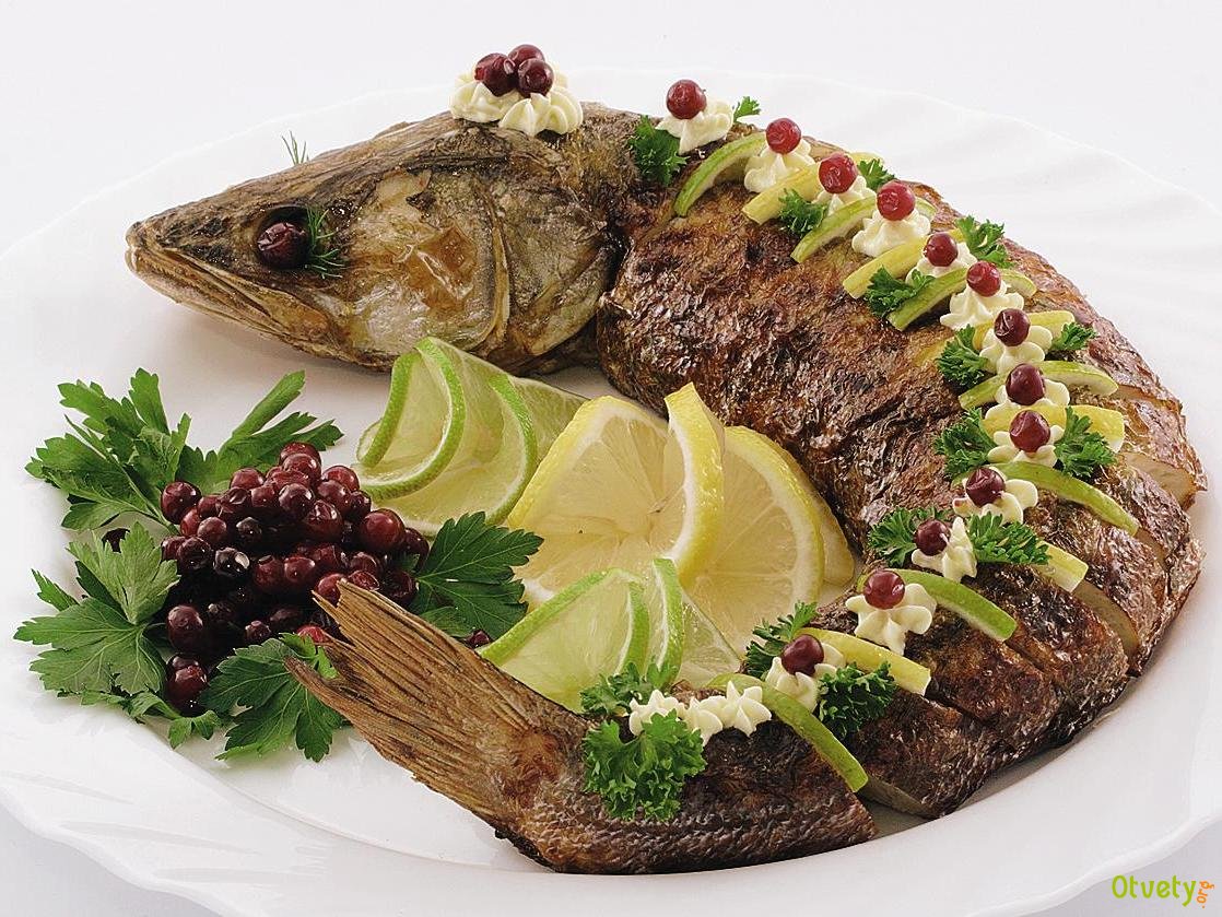фаршировать его полученной начинкой. Для тог чтобы фарш не лип к рукам, время от времени смачивайте ладони в холодной воде. В этом процессе важно не переусердствовать, потому что если вы набьете в кожу много фарша, то она лопнет в процессе приготовления в духовом шкафу. Не бойтесь, если фарш останется, из него можно приготовить очень вкусные котлеты. Опять же мокрыми руками осторожно разгладьте кожу и постарайтесь придать ей более – менее правдоподобный вид, приложимте к нужному месту отрезанную голову и заверните рыбу в бумагу, действуя очень осторожно. Противень выложите вощеной бумагой и на нее положите вашу щуку, затем отправьте рыбу в духовку, которая должна быть к тому времени разогрета до температуры в 180 градусов. Время, которое понадобиться для полного запекания , составляет от получаса до часа -полтора, в зависимости от размера самой рыбы. Чтобы быть уверенными в готовности, за десять минут до истечения положенного времени, раскройте бумагу и смажьте верх щуки сливочным маслом и больше не заворачивайте. Когда рыба будет готова, достаньте ее и дайте время остыть. После этого, удалите все нитки, которые были использованы и порежьте рыбу на порционные куски. Теперь приступите к украшению вашего вкуснейшего блюда. Листья салата вымойте под проточной водой, затем обсушите на бумажном полотенце. Лимон порежьте очень тонкими дольками и проложите им все куски рыбы. На поверхности кусочков рыбы можно сделать разнообразные узоры и дополнить их половинками оливок.