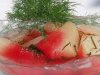 Положите арбуз на стол и выберете, в какой позиции он принимает самое устойчивое положение. Затем, слегка надавливая ножом на корочке, обозначьте края корзины и ручку. У вас получится, примерно, ½ часть арбуза или чуть больше останется для самой корзинной чаши, над которой небольшая плоска арбузной корки - ручка, по форме напоминающая радугу, будет соединять два противоположных края.
