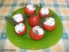2. Мелко нарежьте зеленый лук и смешайте его с рассыпчатым творогом. Наполните смесью помидоры и накройте помидорными «крышечками».