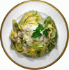Способ приготовления. Мясо смажьте оливковым маслом, отложите в сторону. Мелко нарежьте лук, обжарьте его с половиной топлёного масла до мягкости на среднем огне, влейте вино, выпарите наполовину. Протрите соус через сито, влейте бульон, добавьте костный мозг, выпарите наполовину, протрите через сито, прогрейте, добавляя кусочки масла (по мере того, как предыдущий кусочек растворится). Посолите, поперчите (белый перец), добавьте мелко рубленную зелень, уберите с огня. Мясо посолите, поперчите (чёрный перец), обжарьте с обеих сторон по 3-4 мин в топлёном масле на средне-сильном огне, переложите в соус, прогрейте пару минут. Подавайте с картофелем.