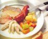 Способ приготовления. Замочите на ночь фасоль в холодной воде, воду слейте и залейте свежей. Залейте свиную ножку, грудинку и чесночную колбасу (все целиком) холодной водой, доведите до кипения, через минут пять слейте воду, всё промойте, добавьте свиную кожу, залейте свежей холодной водой, снова доведите до кипения. Затем добавьте неочищенными чеснок, лук, букет гарни, замоченную фасоль, очищенную морковь, доведите до кипения, готовьте 2 часа на слабом огне (до готовности фасоли). Тем временем нарежьте баранину, предварительно очистив от плёнок, кусками по 2 см. Лук нарежьте четвертинками, затем поперёк, морковь нарежьте ломтиками наискосок. Овощи обжарьте в масле на среднем огне до мягкости лука, огонь увеличьте, добавьте баранину и обжарьте её до лёгкой золотистости, посолите, поперчите, всыпьте и обжарьте муку (минуты две), влейте и выпарите вино, добавьте помидоры кусочками (если надо, добавьте сахар). Через 5 мин влейте два половника бульона из-под варящейся фасоли, добавьте чеснок, букет гарни, проварите до загустения. Мясо и морковь выньте и отложите, чеснок очистите, верните обратно в соус, протрите всё через сито. Выньте из бульона овощи и удалите, колбасу и грудинку нарежьте кусками (удобными для еды), свиную шкурку нарежьте кубиками, разберите свиную ножку и нарежьте ее кусочками (кости удалите). Подготовьте утиные (в оригинале гусиные) ножки, сняв мясо с кости. Соберите горшок: натрите чесноком стенки и дно посуды, выложите слоями свиную кожу, утиное мясо, 1/3 отваренной фасоли, несколько ложек соуса, баранину с морковью, куски своной ножки, поперчите, затем снова слой фасоли, соус, кусочки грудинки и колбасы, снова поперчите, опять - слой фасоли и соус (оставьте несколько ложек). Смешайте сухари с соусом, выложите их поверх всего, полейте гусиным жиром (можно палочкой сделать отверстие до дна и влить в него полстакана бульона), готовьте в духовке в течение часа при температуре 150 градусов С.