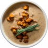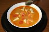 Способ приготовления. Обжарьте неочищенные креветки с ложкой масла по 1 минуте с каждой стороны на сильном огне, выньте, очистите и отложите. Подсушите на среднем огне в сковородке креветочные панцири (выньте и отложите), добавьте мелко рубленный лук, готовьте до мягкости. Смолите обжаренные панцири блендером (или в ступке), переложите к луку, влейте бульон, добавьте раскрошенный хлеб, чабер, лавровый лист доведите до кипения, готовьте 10-15 минут на среднем огне. Лавровый лист удалите, суп пюрируйте блендером, процедите через сито, проварите до загустения, добавьте креветки, влейте сливки, прогрейте (но не кипятите), поперчите, посолите. Подавайте с крутонами.