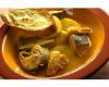 Ингредиенты: 3 кг морской рыбы (скорпена, мерлан, солнечник, морской черт, каранкс, морской петух), 150 мл оливкового масла, 2 помидора, 2 луковицы, 1 лук-порей, 4 дольки чеснока, 2 лавровых листика, 0,5 ч.л. семян фенхеля, кожура апельсина, веточка тимьяна и чебреца, 2 стручка острого красного перца, соль, перец, щепотка нитей шафрана, багет.