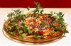 Смазать корж растительным маслом, кетчупом или томатным соусом и уложить начинку. Начинка для пиццы может быть самая разная. В данном рецепте это маринованные огурцы, лук, помидоры, болгарский перец, оливки, ветчина, колбаса, сыр. Можно добавить готовую приправу для пиццы или острый перец. Выпекается пицца 25 минут при температуре 180° С.