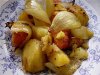 Картофель очистить и нарезать не очень толстыми кружочками, примерно с полсантиметра толщиной. Очистить лук и нарезать его кольцами примерно такой же толщины, что и картошка. Картофель вместе с луком положить в глубокую миску. Растительное масло перемешать со специями и солью, вылить в картошку с луком и хорошо перемешать, чтобы картошка была равномерно покрыта маслом. Разделить картошку на небольшие порции, на 3 – 4 части, каждую разложить в один слой на фольге (фольгу лучше сложить в два – три слоя) и завернуть конвертом. Края у конверта должны быть очень плотно и хорошо закрыты. Завернутую картошку положить в духовку. Запекать минут 20 с одной стороны, затем перевернуть и запекать еще столько же с другой стороны. Такая картошка – прекрасный гарнир к любому мясу, птице, жареным колбаскам.