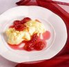 Положите на половину теста мелко накрошенные савоярди (бисквитное печенье), сверху положите фрукты. Разогрейте духовку до 220°С.