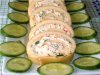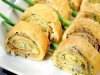 Далее готовим рулет с огурчиками (корнишонами). Смазываем ветчину майонезом, укладываем миниатюрный огурчик и сворачиваем рулет. И опять же закрепляем его шпажкой.