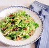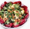 Выложите в салатник курчавый салат, в середину положите салат корн и сельдерей, сверху - пармезан и фундук.