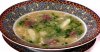 Картофель, лук очищают, курагу моют и разрезают пополам. Картофель нарезают кусочками, лук полукольцами. Бульон доводят до кипения и добавляют туда нарезанный картофель. В сковороде разогревают топленое масло, слегка обжаривают в нем нарезанный лук. Затем добавляют к нему томатную пасту, обжаривают все вместе несколько минут. Обжаренный с томатом лук отправляют в кастрюлю с супом, когда картофель будет почти готов. В суп добавляют ломтики говядины, нарезанную кусочками курагу, горошины черного перца, соль - по собственному усмотрению. Доводят до кипения и снимают с огня.