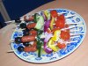 После этого кусочки куриного филе нанизывают на смоченные водой бамбуковые палочки.