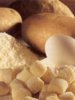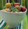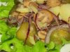 2. Тем временем почистите картофель и нарежьте его ломтиками. Почистите и помойте лук-порей, нарежьте его тонкими кольцами и варите в кипящей воде 5 минут. Слейте и остудите. Промойте руколу под струей воды, обсушите и нарежьте.