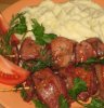 Когда заданное время выйдет, наденьте на шпажки (импровизированные шампура) кусочки мяса и обжарьте их в хорошо разогретом масле. После того, как мясо будет готово, обжарьте в оставшемся масле замаринованный лук.