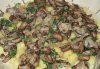 Для начала необходимо обмыть хорошенько шампиньоны. Затем нарезаем каждый гриб пополам. Кладём грибочки в сковороду и обжариваем на оливковом масле совсем недолго. В самом конце солим и перчим грибочки.
