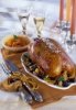 Утятницу вынимаем из духовки и заливаем утку коньячным соусом с помидорами.
